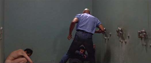 In prison there is a big guy who cruising for some ass, prison style. He sneaks up on Eddie, who is alone in the showers, but Eddie ain’t gonna go down with out a fight (pun very much intended). It looks like Eddie is losing outright when out of nowhere, Woody Strode comes along and beats the tar out of both men.  You know, to be fair.